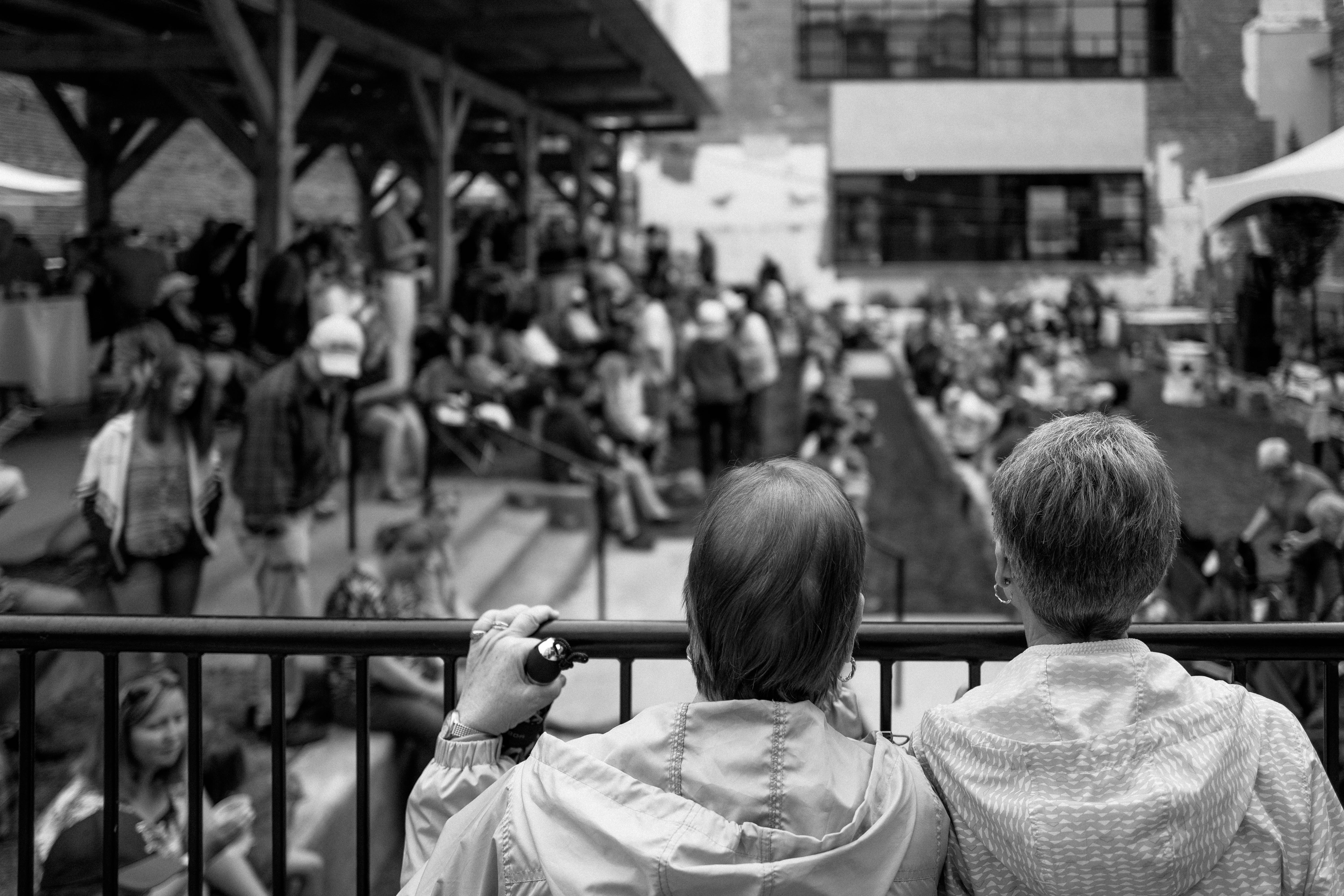 Two figures stand close together, observing a bustling crowd from behind a railing, their backs turned to the viewer. The photograph's black-and-white palette enhances a sense of nostalgia, while the blurred crowd in the background evokes a lively yet distant atmosphere. Soft, natural light illuminates the scene, emphasizing the bond of companionship amid the chaos.