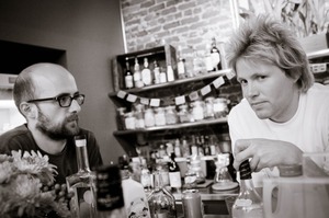In this black-and-white photograph, two men engage in a quiet moment at a bar, encapsulated by a backdrop of neatly arranged bottles. The warm, subdued lighting casts soft shadows, creating an intimate, contemplative mood. Their expressions reveal a blend of curiosity and introspection, hinting at a deeper conversation amidst the lively atmosphere.