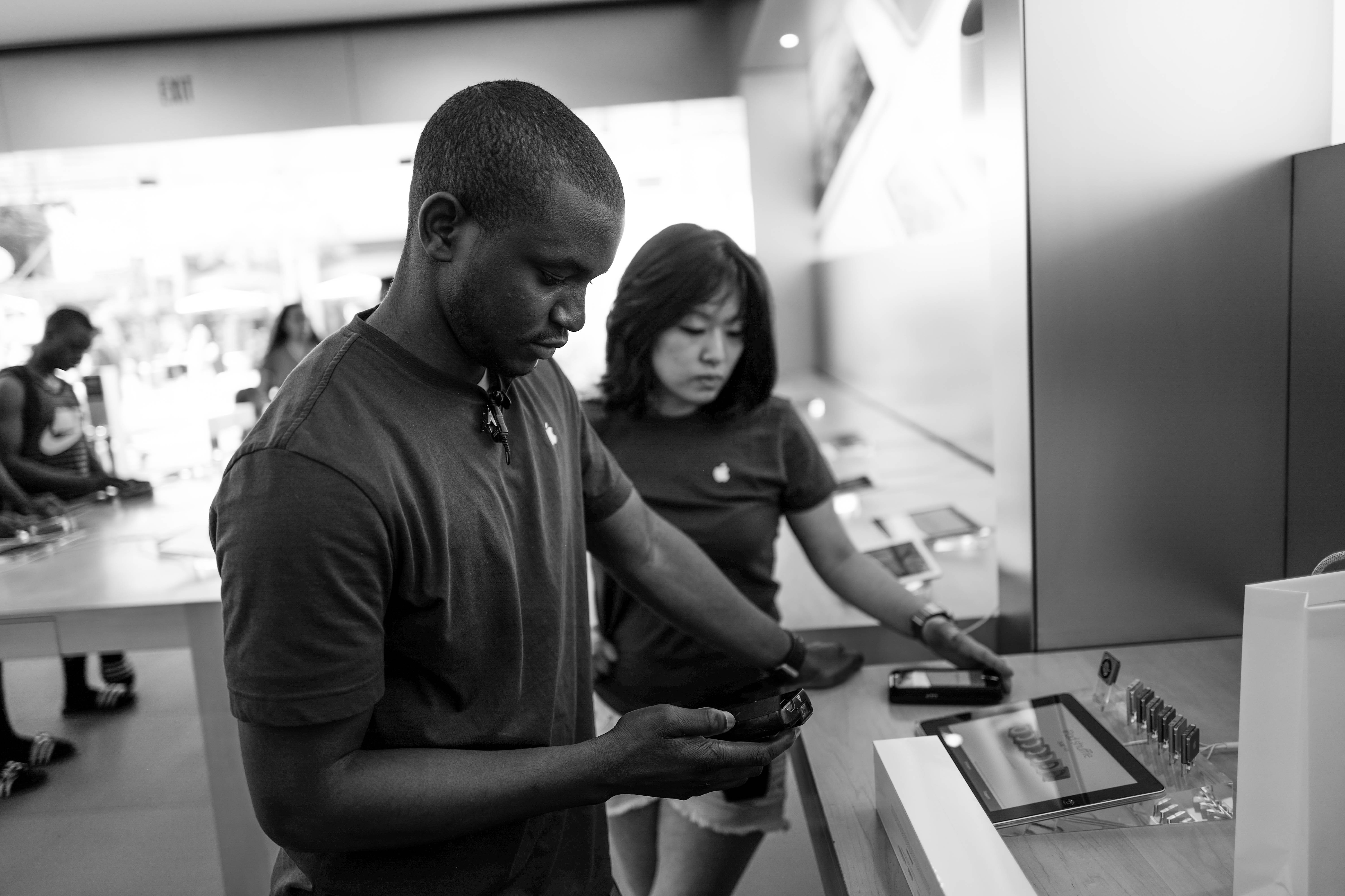In a sleek, modern retail space, two individuals are engrossed in their own technological explorations, one examining a device closely while the other stands nearby, focused on her own. The photograph, rendered in striking black and white, captures a calm, contemplative mood, emphasizing the subtleties of concentration and curiosity. Soft lighting highlights their expressions, creating a stark contrast with the polished surfaces around them.