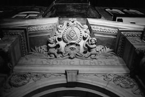 The photograph captures the intricate stonework of a Masonic Temple, showcasing two cherubic figures that seem to watch over the entrance. The composition, leaning upward, emphasizes the grandeur of the architecture against a darkened sky, evoking a sense of mystery and reverence. The monochromatic lighting highlights the textures of the sculpture, enhancing the solemn and historic mood of the scene.