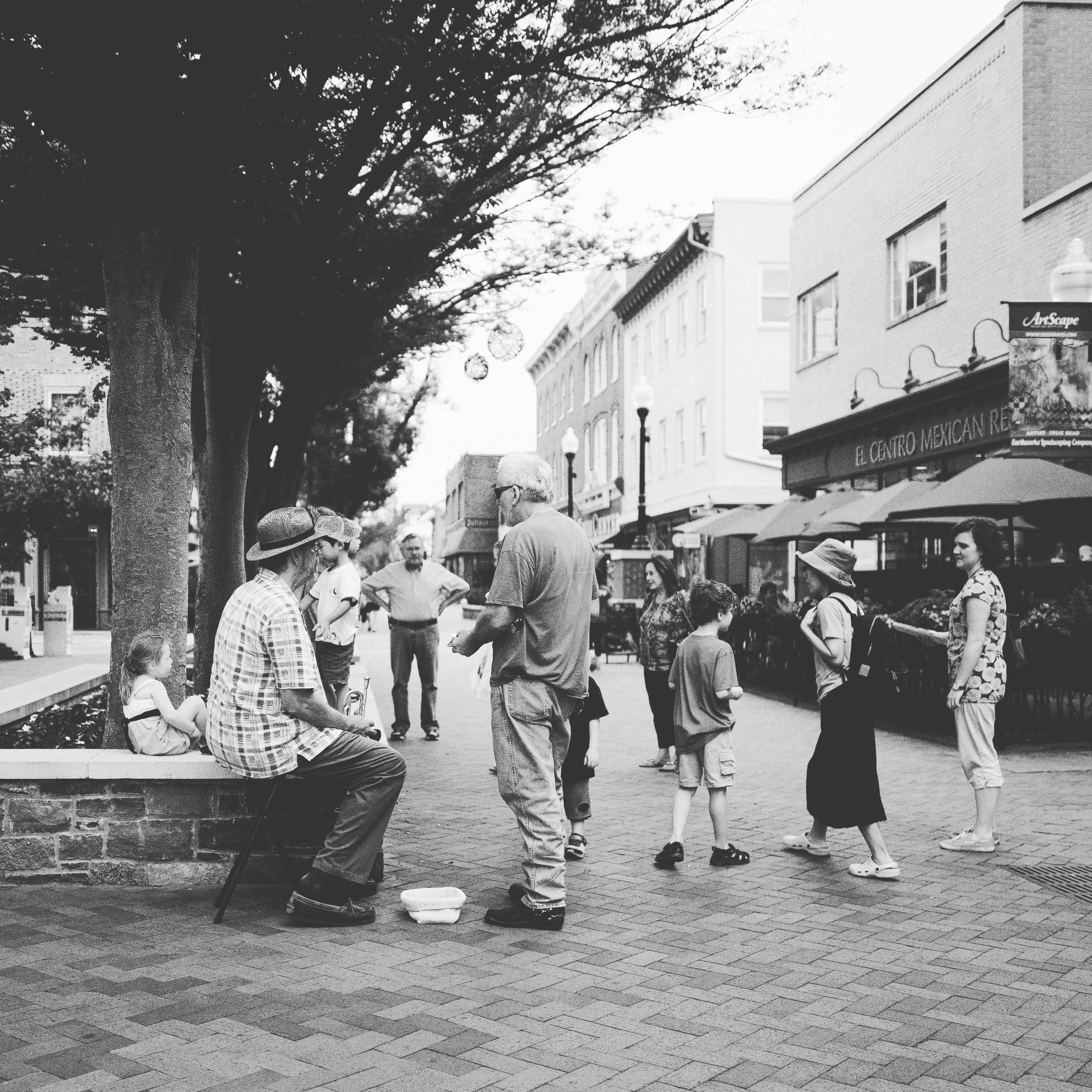 In a lively public square, a diverse group of people engages warmly with a seated man, embodying a sense of community and spontaneity. The muted tones of the black-and-white photograph evoke nostalgia, while the trees provide a natural frame, creating an intimate yet open ambiance. The scene is alive with conversation, capturing a fleeting moment of connection among strangers.