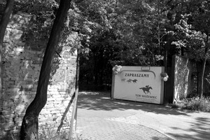 The photograph captures an inviting yet enigmatic entrance to a horse racing track, framed by lush greenery and rustic brick walls. The contrasting black-and-white tones evoke a nostalgic mood, hinting at forgotten stories and past excitement. Soft shadows interplay with natural light, drawing the eye to the vibrant sign adorned with balloons, suggesting a lively event waiting just beyond the gates.