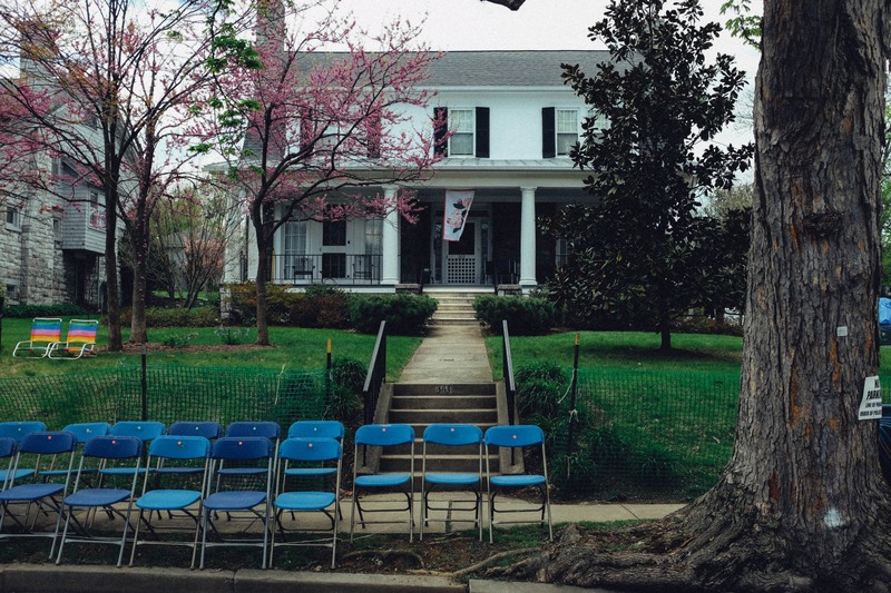 The photograph captures a charming white house, adorned with pink budding trees and a welcoming porch. Blue chairs line the path leading to the entrance, hinting at an upcoming gathering, while the soft light imbues the setting with a serene yet anticipatory mood. The composition balances nature and architecture, celebrating the vibrancy of spring.