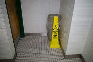 This photograph captures a corner of a restroom, dominated by a bright yellow caution sign warning of a wet floor. The minimalist composition, with its tiled flooring and stark white walls, evokes a sense of sterile caution, while the muted lighting adds an air of caution and stillness to the scene.
