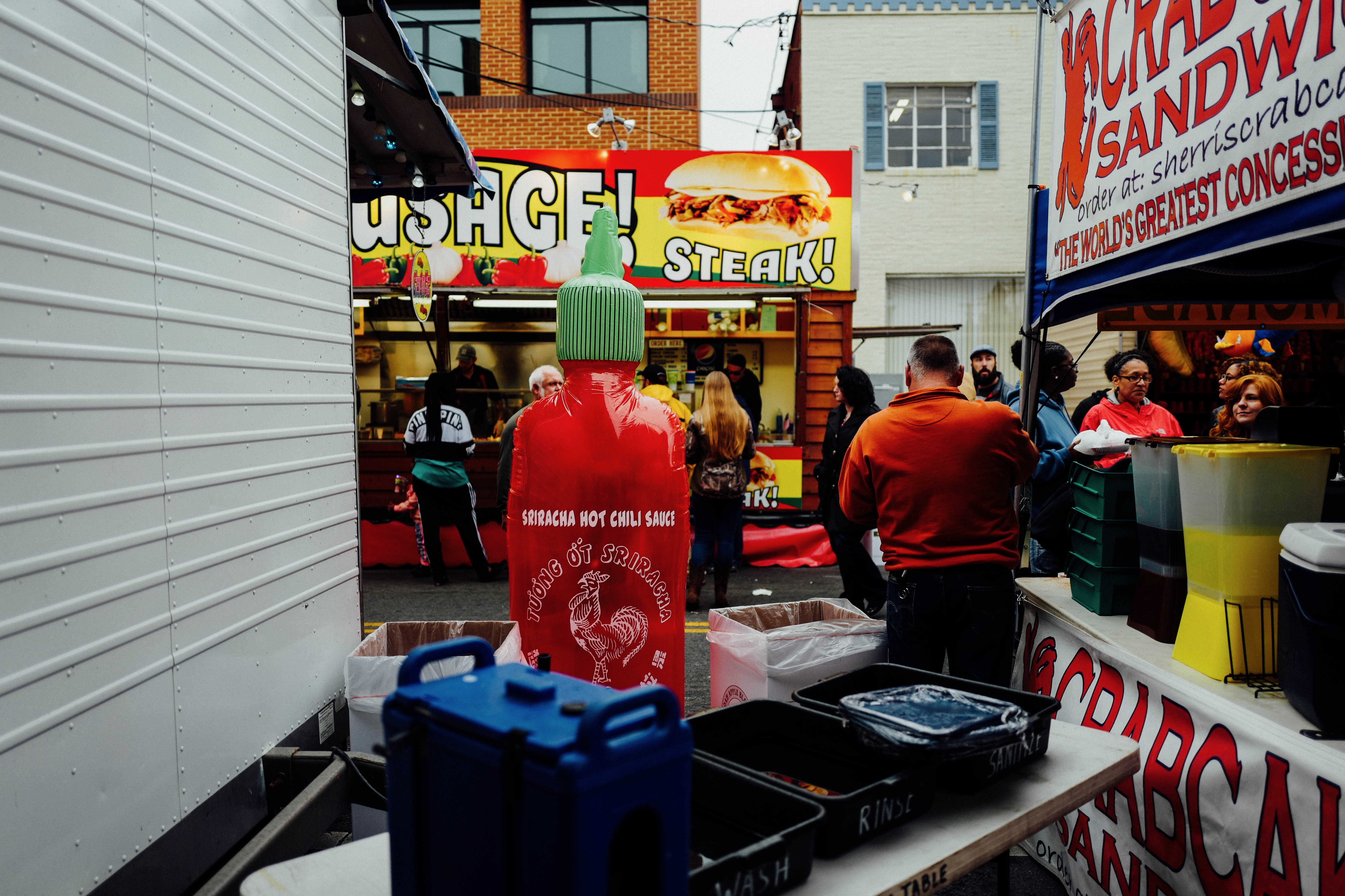 The photograph captures the lively atmosphere of a food festival, focusing on a giant Sriracha bottle that whimsically stands guard over various food stands. Bright colors and eye-catching signage create an energetic mood, while the soft lighting enhances the inviting feel of this bustling scene filled with excited patrons. The composition draws the eye towards the vibrant stalls, contrasting with the muted tones of the surrounding environment.