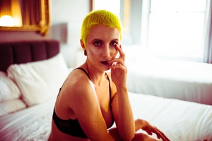 This intimate portrait captures a model with vibrant yellow hair, exuding confidence in a softly lit room. The juxtaposition of her bold look against the serene backdrop of white bedding creates an intriguing tension. The lighting highlights her features and draws attention to her piercing gaze, evoking a sense of allure and introspection.