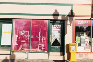 A storefront with a vibrant pink display window contrasts sharply with its surroundings, which reveal signs of neglect. The warm morning light casts long shadows, enhancing the sense of abandonment felt by the broken glass and 'For Rent' sign. This juxtaposition evokes a bittersweet mood, hinting at lost potential amid a bustling street.