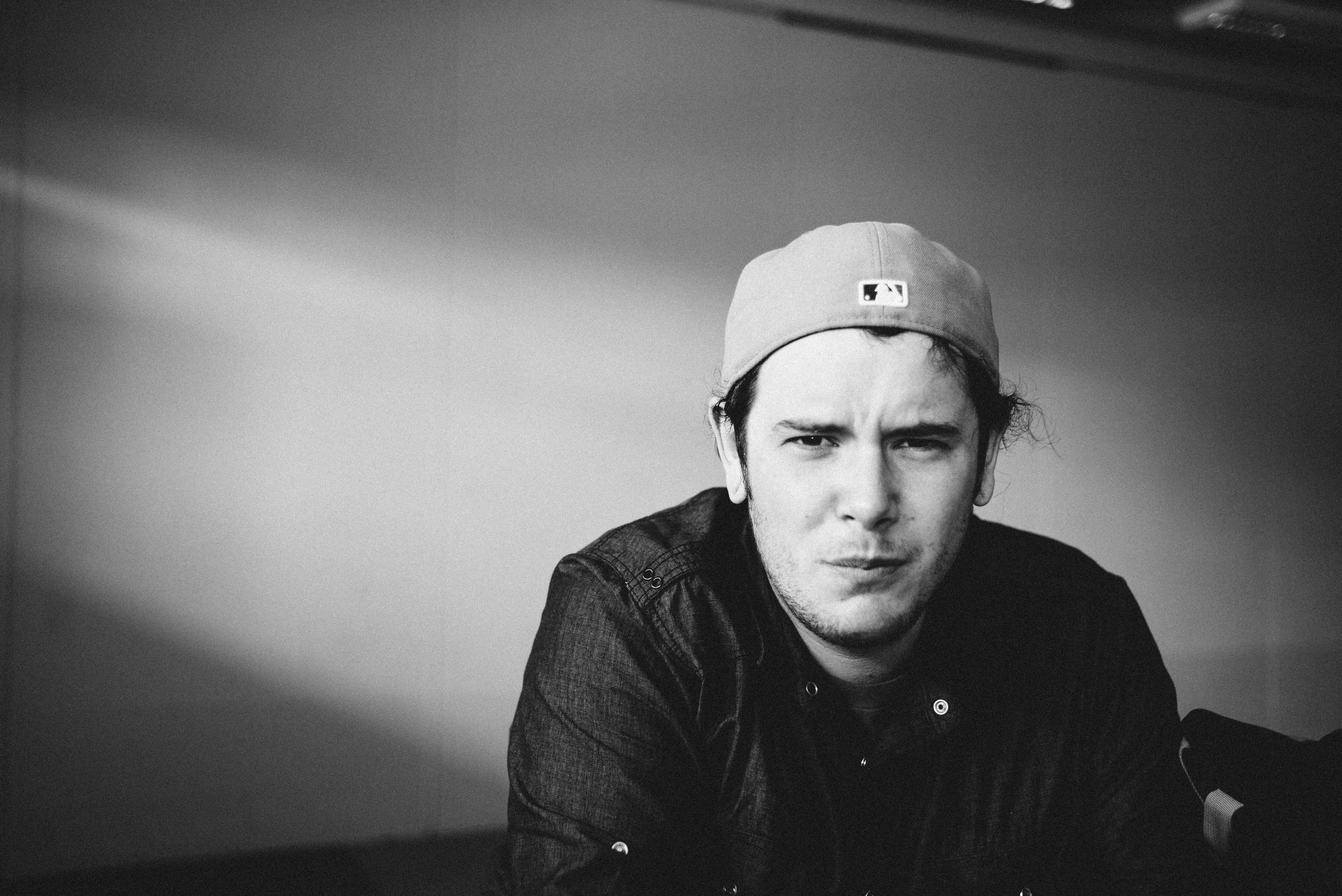 In this striking black and white photograph, a young man gazes intently at the camera, embodying a sense of contemplation. The soft, natural light casts subtle shadows, enhancing the intensity of his expression and the textures of his clothing. The composition focuses on his face, drawing the viewer into his thoughtful mood against a minimalistic backdrop that suggests simplicity and depth.