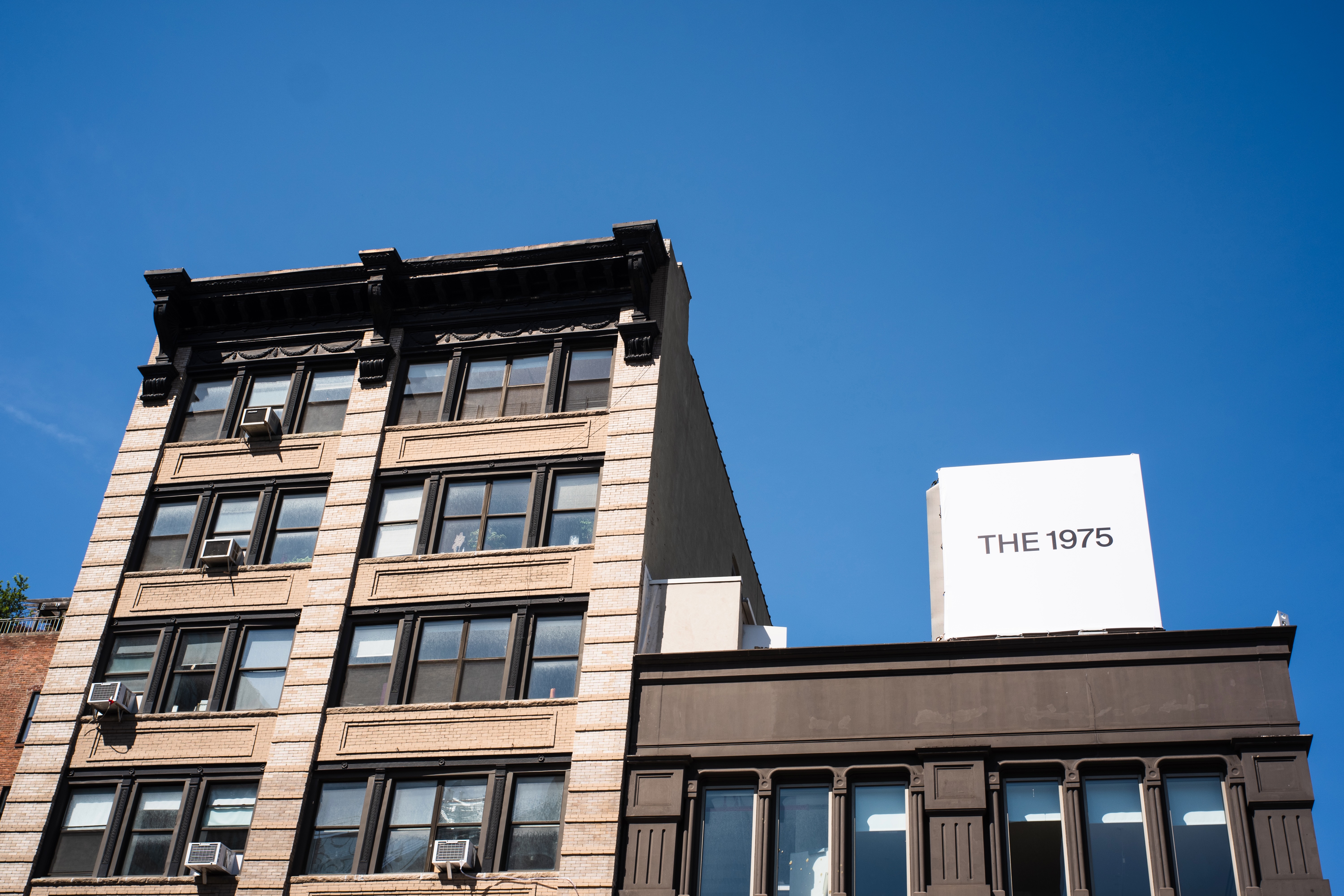 This photograph captures a striking view of a vintage building framed against a clear blue sky. The composition centers on the architectural details, highlighting the textures and contrasts between the two facades, while the stark white sign of 'THE 1975' adds a contemporary twist, hinting at cultural intersections. The bright lighting enhances the vividness of the scene, creating an uplifting and vibrant mood.