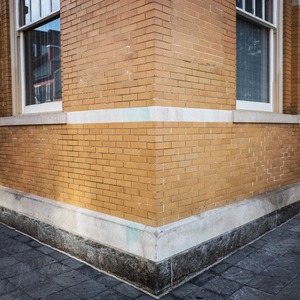 The photograph presents a close-up view of a building's corner, where warm, textured brick meets a heavy stone base. Soft, natural light highlights the subtle interplay of shadows and surface textures, creating an intriguing sense of depth and structure. The mood is quiet and contemplative, inviting the viewer to appreciate the simplicity and elegance of urban architecture.