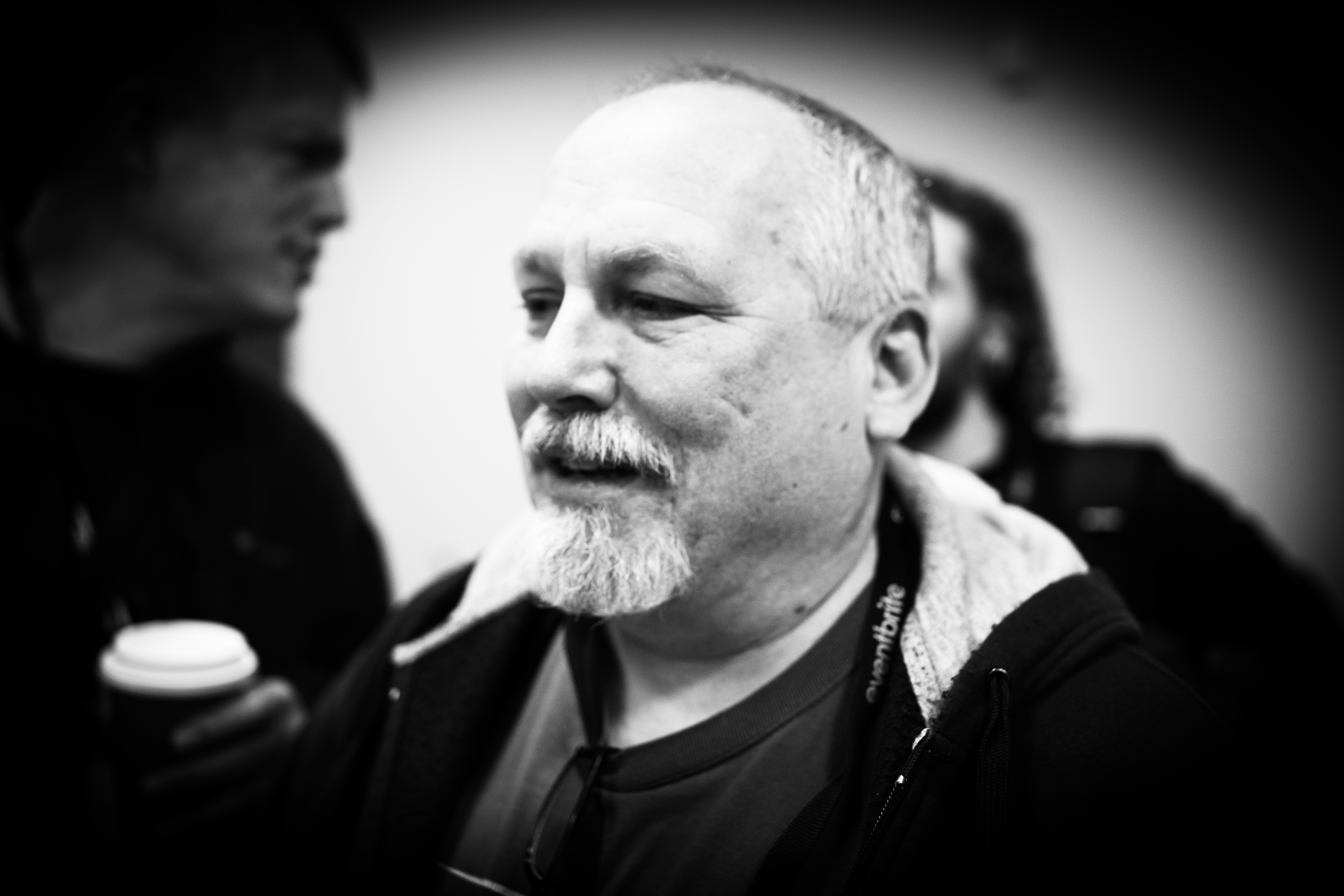 In this candid black-and-white portrait, the focus is on a middle-aged man with a warm smile, capturing a moment of intimacy amid a bustling background. The soft lighting and slight vignette create a nostalgic mood, while his relaxed demeanor invites the viewer into an easy-going atmosphere of conversation. The blurred figures behind him hint at a lively gathering, enhancing the sense of connection and community.