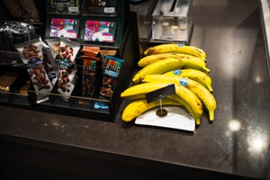 A vibrant assortment of snacks fills a sleek countertop, with a cluster of ripe bananas prominently featured in the foreground. The lighting is warm and inviting, enhancing the glossy surfaces of the dark stone and showcasing the colorful packaging of the snacks behind. This composition evokes a sense of casual convenience, perfect for a quick pick-me-up in a bustling café setting.