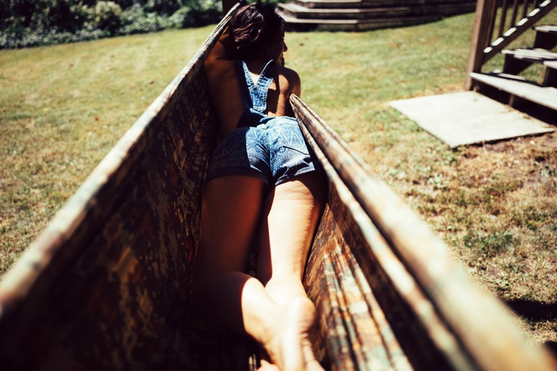 A young woman in denim overalls reclines playfully within a narrow, vintage wooden frame, subtly blending into the grassy outdoor setting. The sunlight casts a warm glow, highlighting the textures of both her skin and the weathered wood, evoking a sense of tranquility and casual intimacy with nature. The composition draws the viewer's eye along the line of the frame, creating a feeling of depth and exploration.