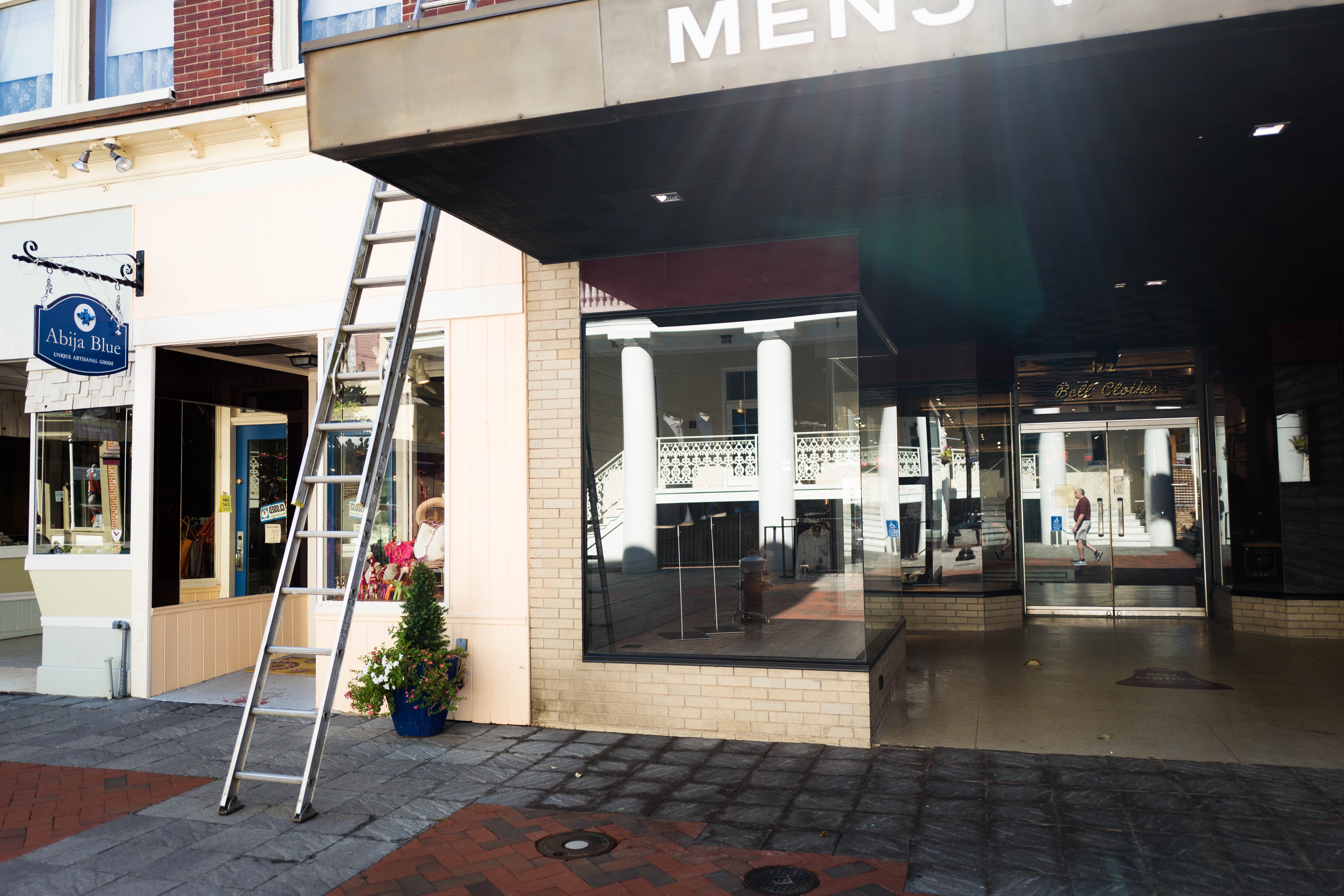 This photograph captures a quiet urban scene featuring contrasting storefronts, with a ladder leaning against a men's clothing shop, hinting at ongoing maintenance. The bright sunlight casts strong shadows on the textured pavement, creating a playful interplay of light and dark. The overall mood is one of tranquil routine, evoking a sense of place where life subtly unfolds amid the backdrop of city architecture.