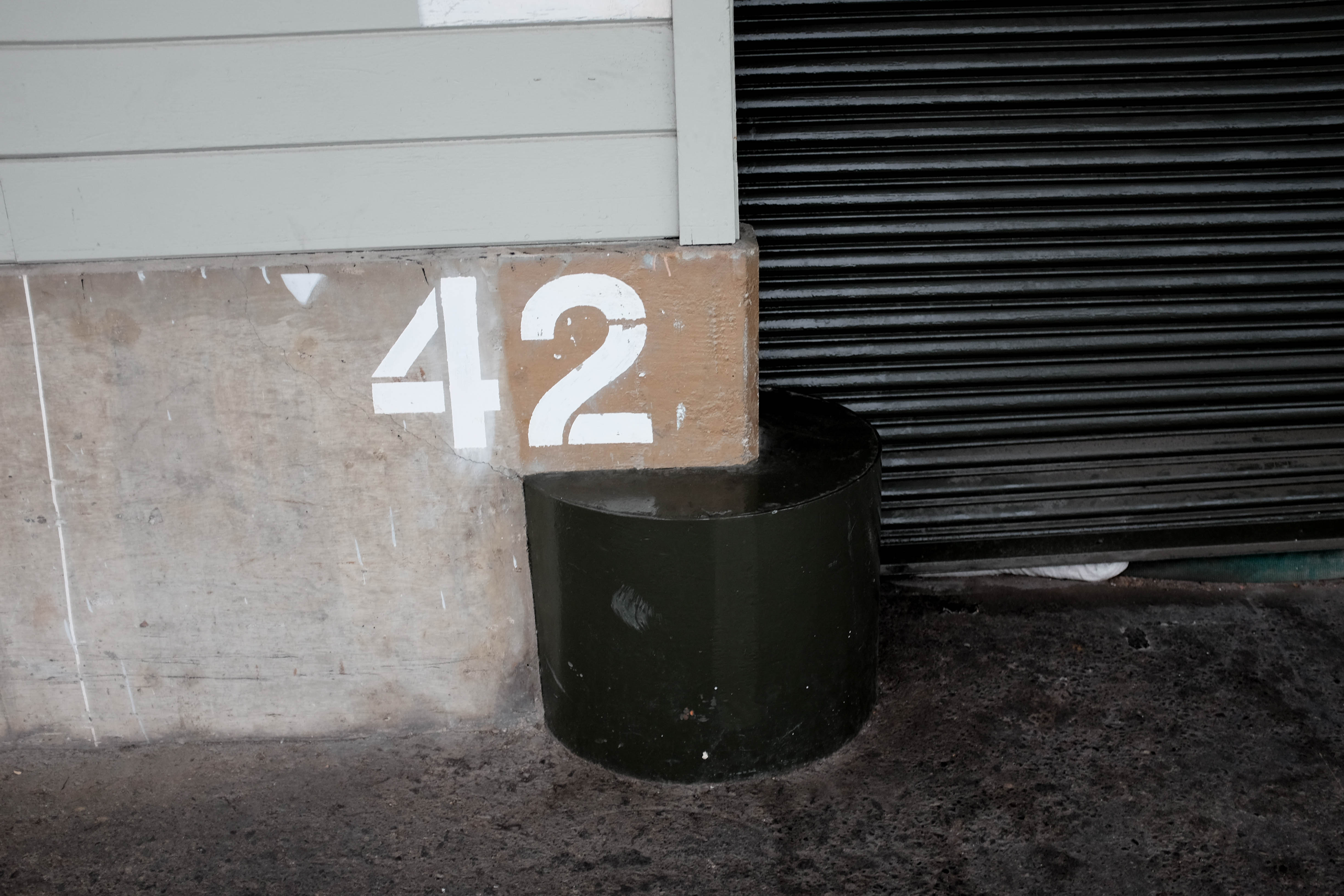 This photograph captures a close-up view of a concrete wall featuring the number '42' in bold white paint, juxtaposed against a dark, understated metal rolling door. The circular green pillar adds a sculptural element, contrasting the sharp angles of the architecture. The cool, muted colors and shadows create a contemplative mood, emphasizing urban solitude and texture.