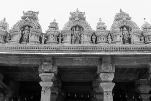 This black-and-white photograph captures the intricate carvings of a temple facade, showcasing divine figures in detailed relief. The composition emphasizes the verticality of the structure, while the soft lighting enhances the texture of the stone, creating a spiritual and timeless atmosphere. The mood evokes reverence and admiration for the craftsmanship, inviting contemplation of the artistry involved.