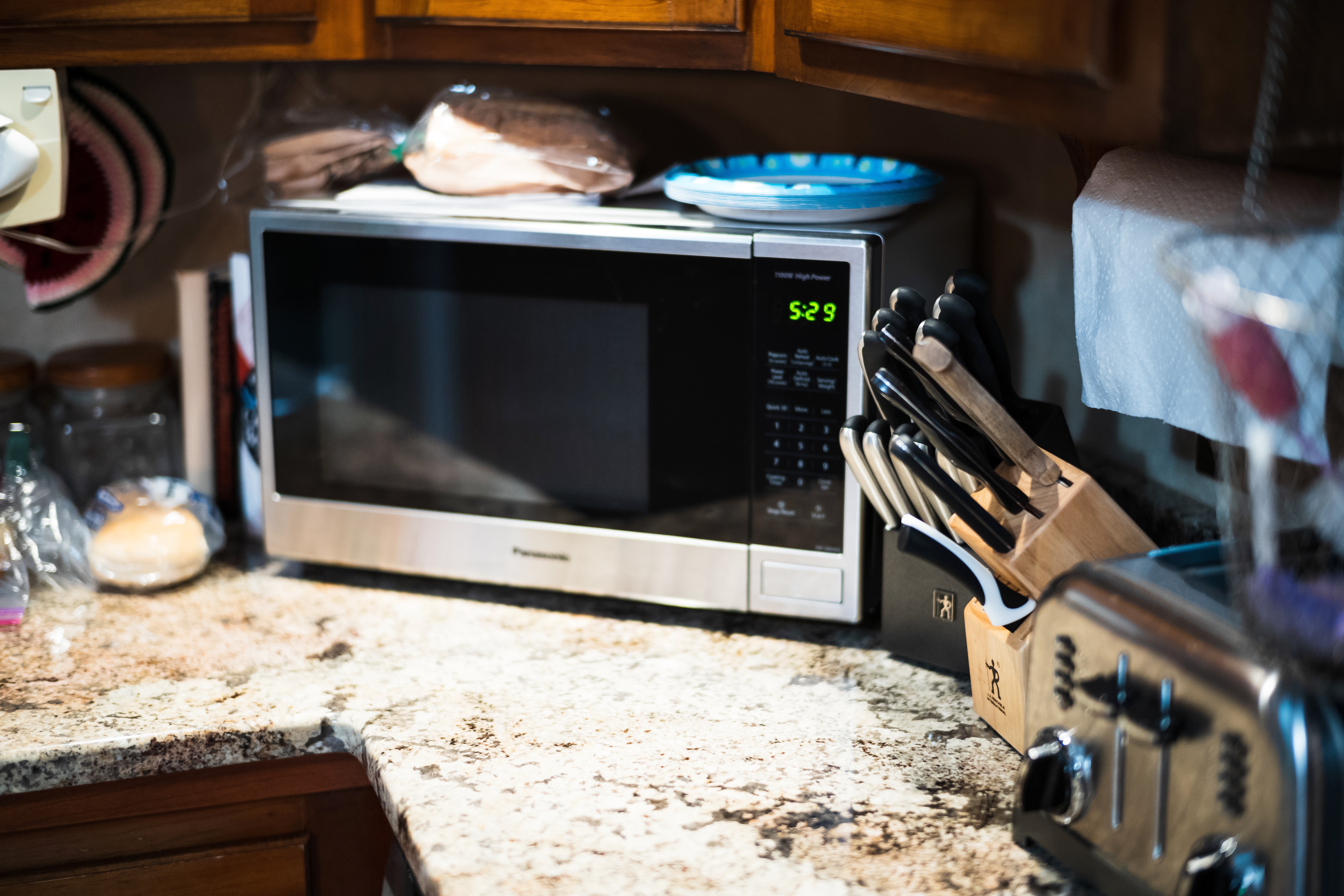 A warm kitchen scene featuring a sleek microwave and an assortment of kitchen utensils. The soft lighting casts gentle shadows over the granite countertop, creating an inviting atmosphere. Everyday items like bread and plates in the background add a sense of homeliness and routine to the composition.