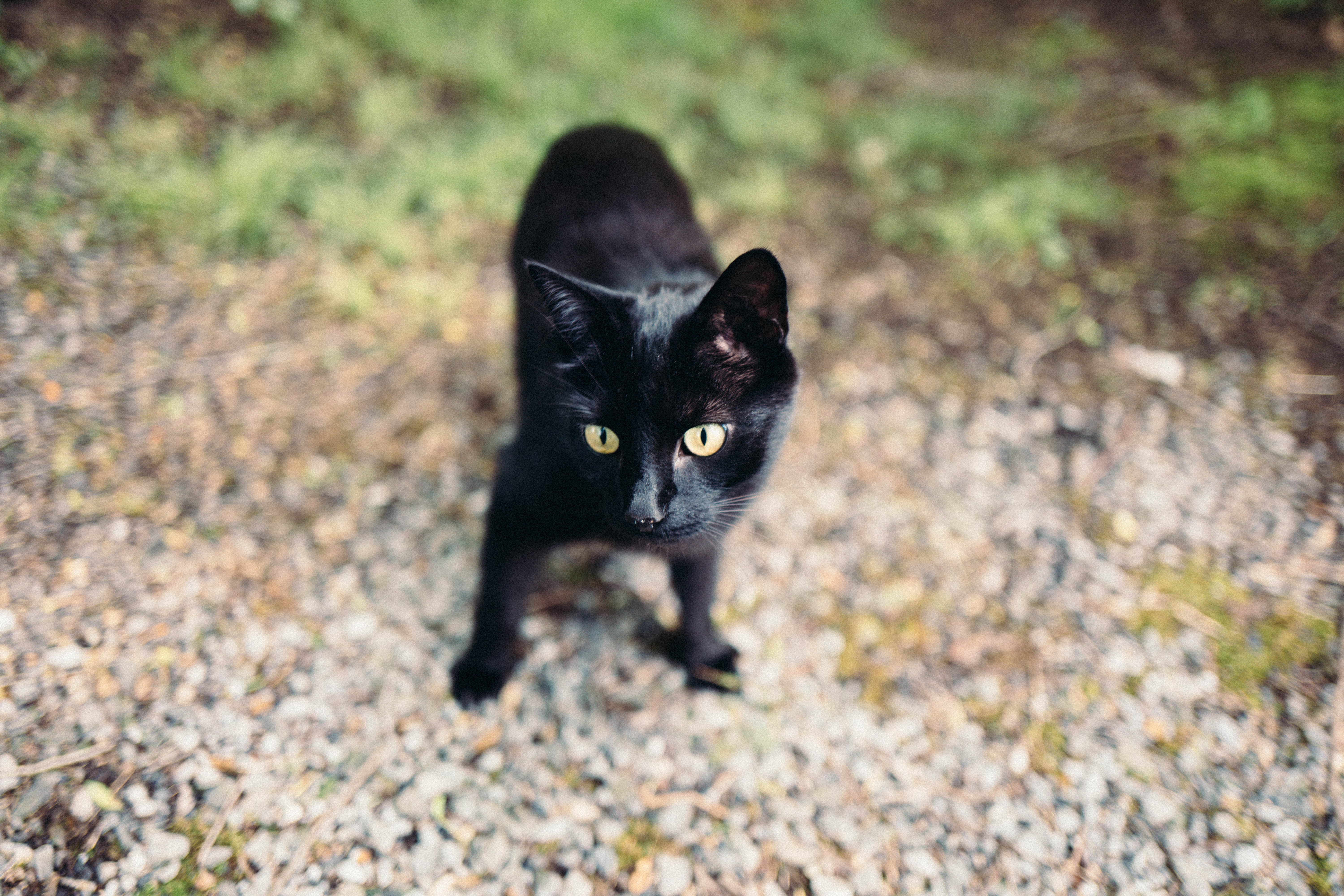 A sleek black cat, poised elegantly against a soft, blurred background of greenery and gravel, captures the viewer's attention with its striking yellow eyes. The composition draws the eye inward, highlighting the cat's inquisitive posture and sharp features, creating an atmosphere of subtle intrigue. Natural light gently illuminates its fur, enhancing the mood of a serene yet watchful presence in a quiet outdoor setting.