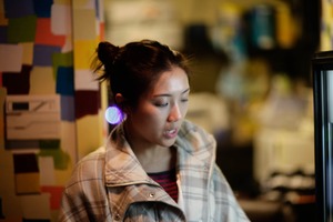 The photograph captures a woman in a plaid coat, deep in thought, against a backdrop of vibrant, multicolored paper squares. Soft, ambient lighting enhances the intimate mood, highlighting her contemplative expression while creating a gentle contrast with the chaotic background. The shallow depth of field subtly draws focus to her face, adding a layer of introspection to the scene.