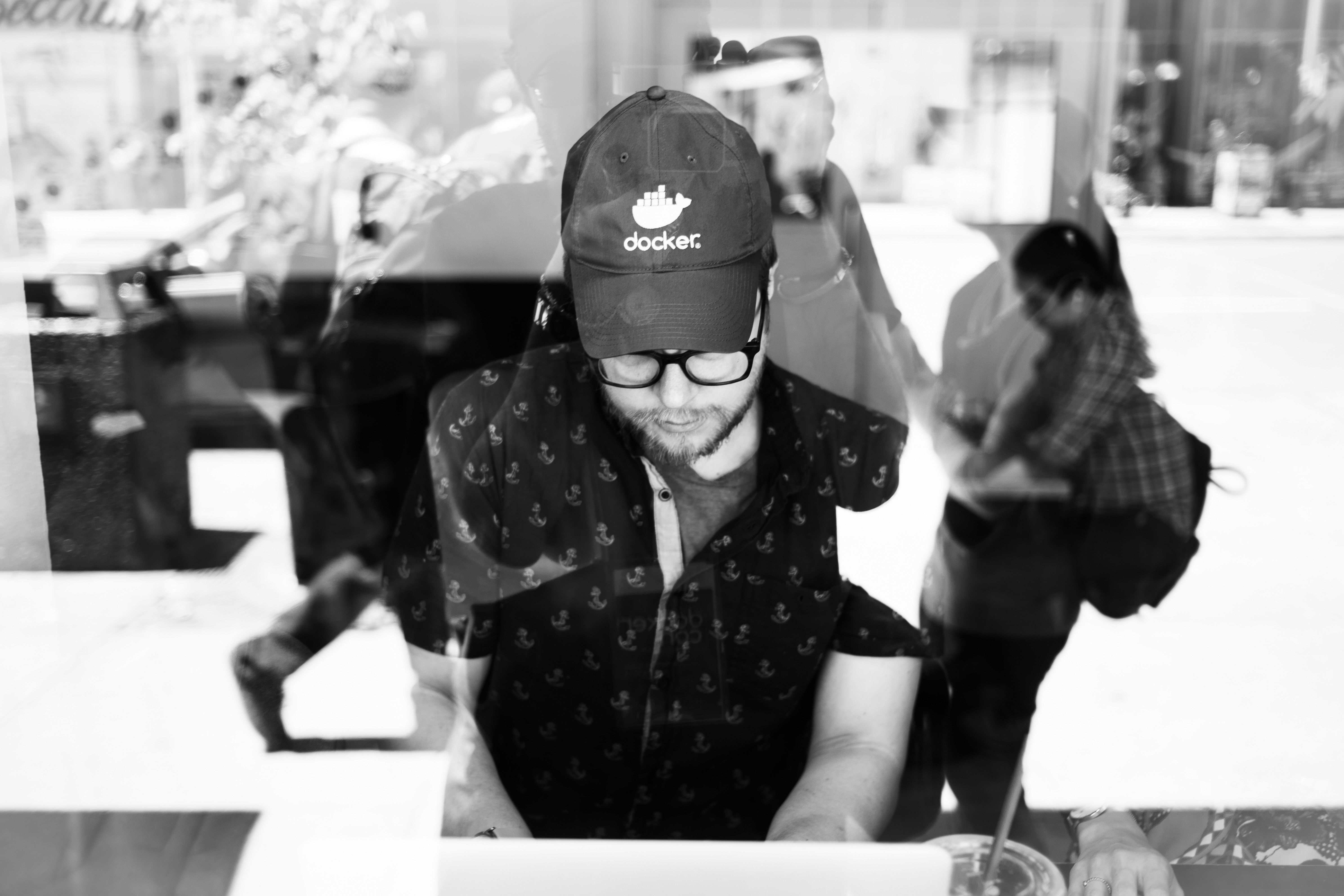 A man sits absorbed in his laptop, framed by a glass window that reflects the bustling street outside. The monochromatic tones enhance the contemplative mood, juxtaposing his concentration with the lively activity beyond. Soft natural light illuminates the scene, emphasizing the intimate yet disconnected atmosphere of urban life.