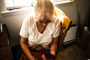 In a softly lit room, an elderly woman sits comfortably in a wooden chair, engrossed in her phone. The sunlight streams in through a nearby window, casting warm stripes across her casual attire and illuminating her contemplative expression. The composition balances the intimate setting with the serene focus on her, evoking a sense of peaceful solitude in the midst of modern technology.