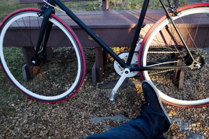 This photograph captures a moment of leisure, featuring a stylish bicycle beside a rustic bench. Soft, warm lighting filters through, creating a relaxed mood as a foot rests casually on the gravel. The composition emphasizes the bike's vibrant wheels and the surrounding natural elements, inviting a sense of calm and exploration.