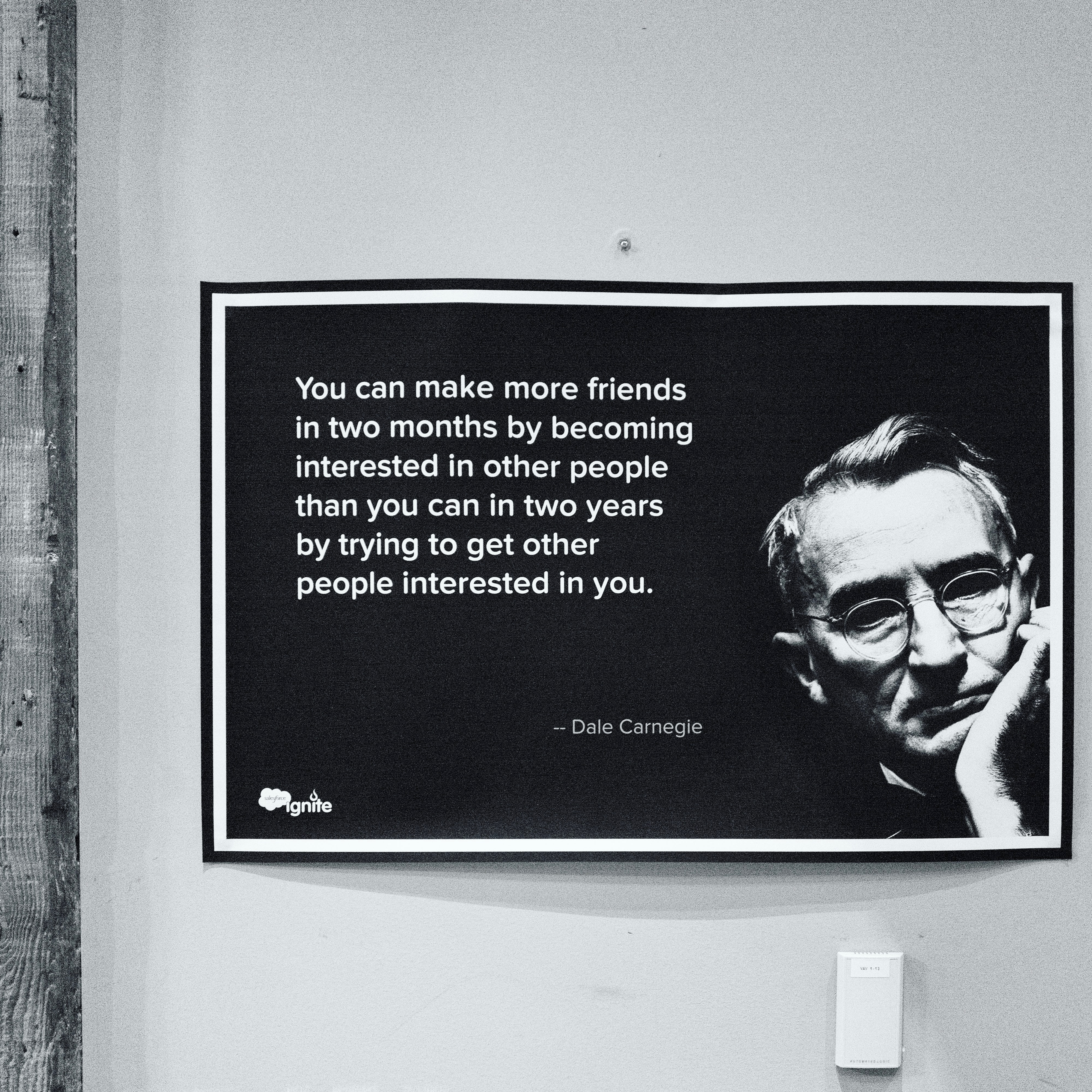 The photograph captures a black and white poster featuring a thoughtful portrait of Dale Carnegie alongside a powerful quote about friendship. The minimalist design focuses the viewer's attention on the stark contrast between the text and background, evoking a contemplative mood. Soft, even lighting enhances the seriousness of the message, making a lasting impression on the viewer.