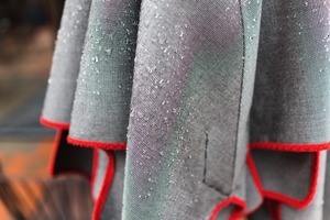 This close-up photograph captures droplets of water glistening on a finely textured, grey fabric with vibrant red edges. The interplay of light creates a soft, reflective quality, enhancing the garment's tactile allure while evoking a sense of freshness and renewal. The composition emphasizes the contrast between the structured form and the elegance of the moisture, inviting a contemplative mood.