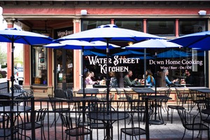 A charming scene at Water Street Kitchen exudes a relaxed vibe, with brightly colored umbrellas casting playful shadows on the outdoor tables. The soft glow of natural light invites patrons to linger, while diners engaged in conversation create a warm, communal atmosphere. The quaint architecture and inviting signage complement the culinary experience, hinting at delicious home-cooked meals inside.