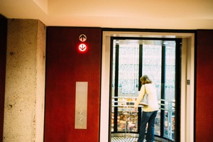 The photograph captures a moment of transition, as a woman steps out of a glass elevator into a bustling space. The warm wooden tones of the elevator's interior contrast with the cool lighting filtering through the glass, creating a sense of depth and movement. The red down arrow adds a touch of urgency, reflecting the dynamic nature of urban life.