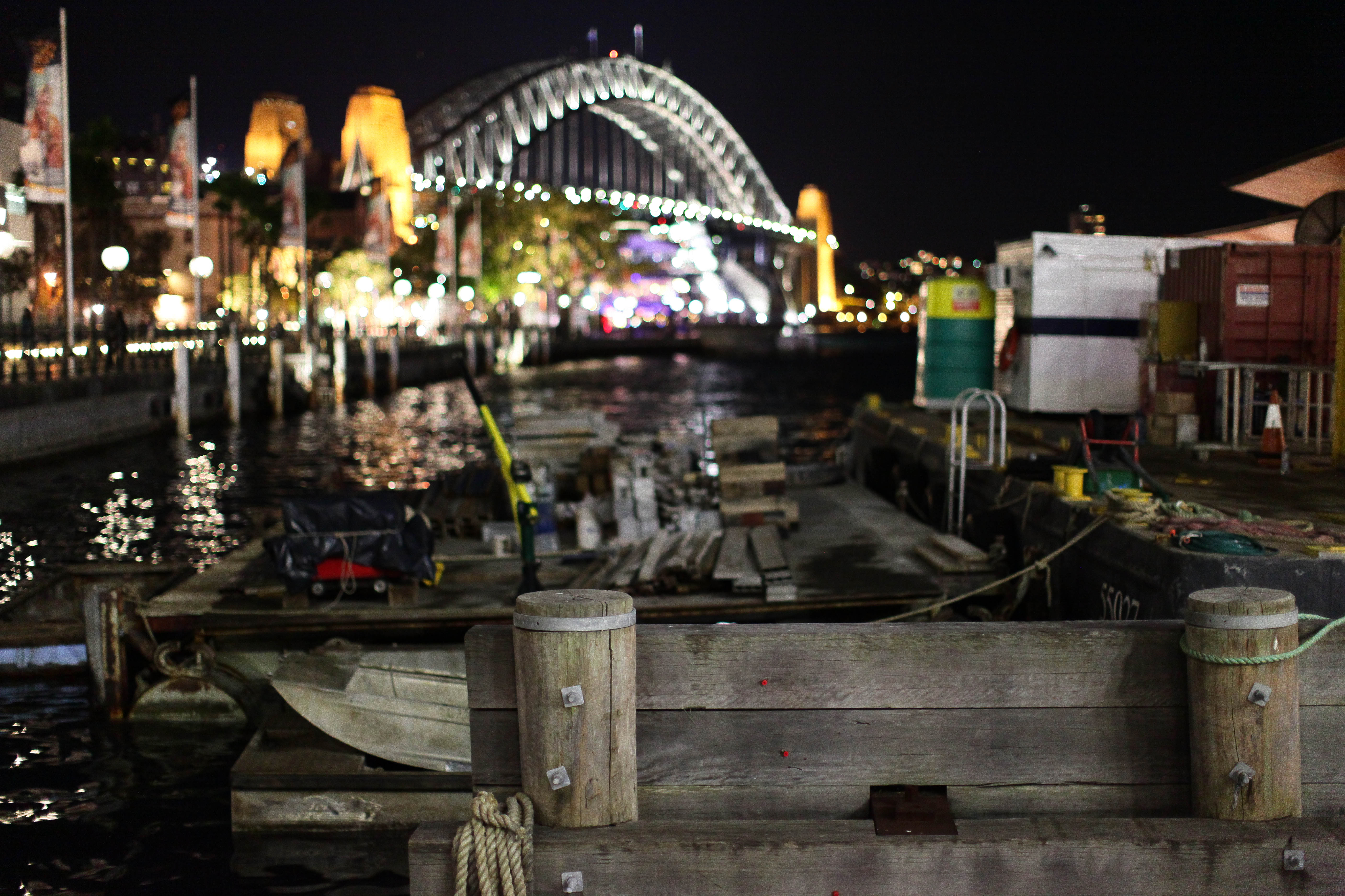 This nighttime photograph captures the bustling Sydney Harbour, featuring a wooden dock in the foreground leading to the iconic Sydney Harbour Bridge. The shimmering water reflects the city lights, creating a vibrant yet tranquil atmosphere. The composition highlights both the rustic charm of the dock and the dynamic energy of the urban landscape beyond, suggesting a harmonious blend of nature and city life under a starry sky.