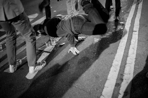 In the heart of the city, a breakdancer showcases agility and skill on the street, illuminated by the ambient glow of nightlife. The monochromatic tones emphasize the intensity of the performance, while onlookers create a dynamic backdrop of movement and energy. Shadows stretch across the pavement, heightening the drama of the moment and capturing the vibrancy of urban culture.
