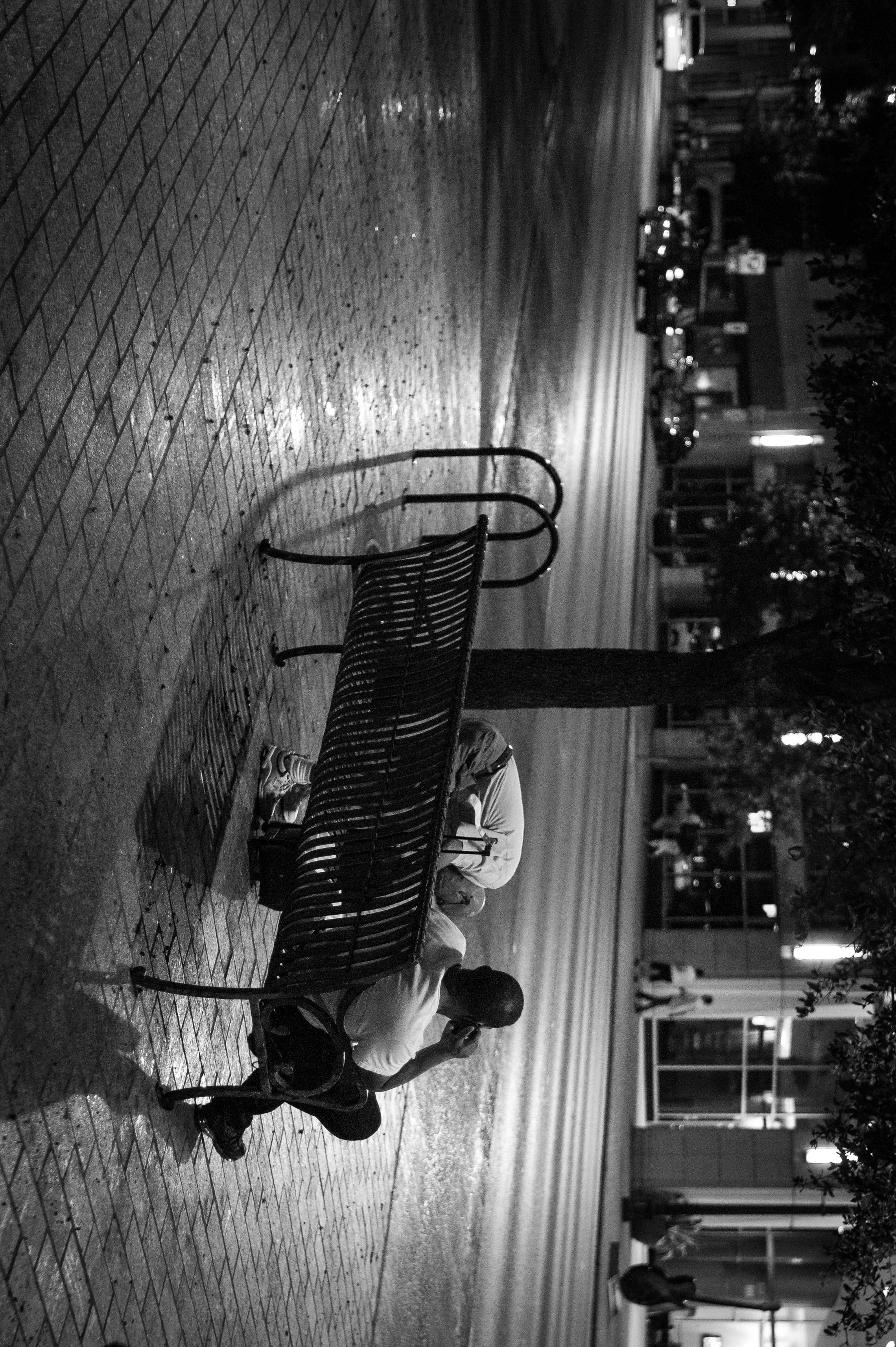 In a monochromatic urban scene, two individuals share a moment on a bench, enveloped by the reflective shimmer of rain-soaked pavement. The somber lighting casts soft shadows, creating an intimate yet melancholic atmosphere amid the quiet of the night. The composition draws the viewer's eye diagonally across the image, emphasizing the sense of solitude and connection in the cityscape.