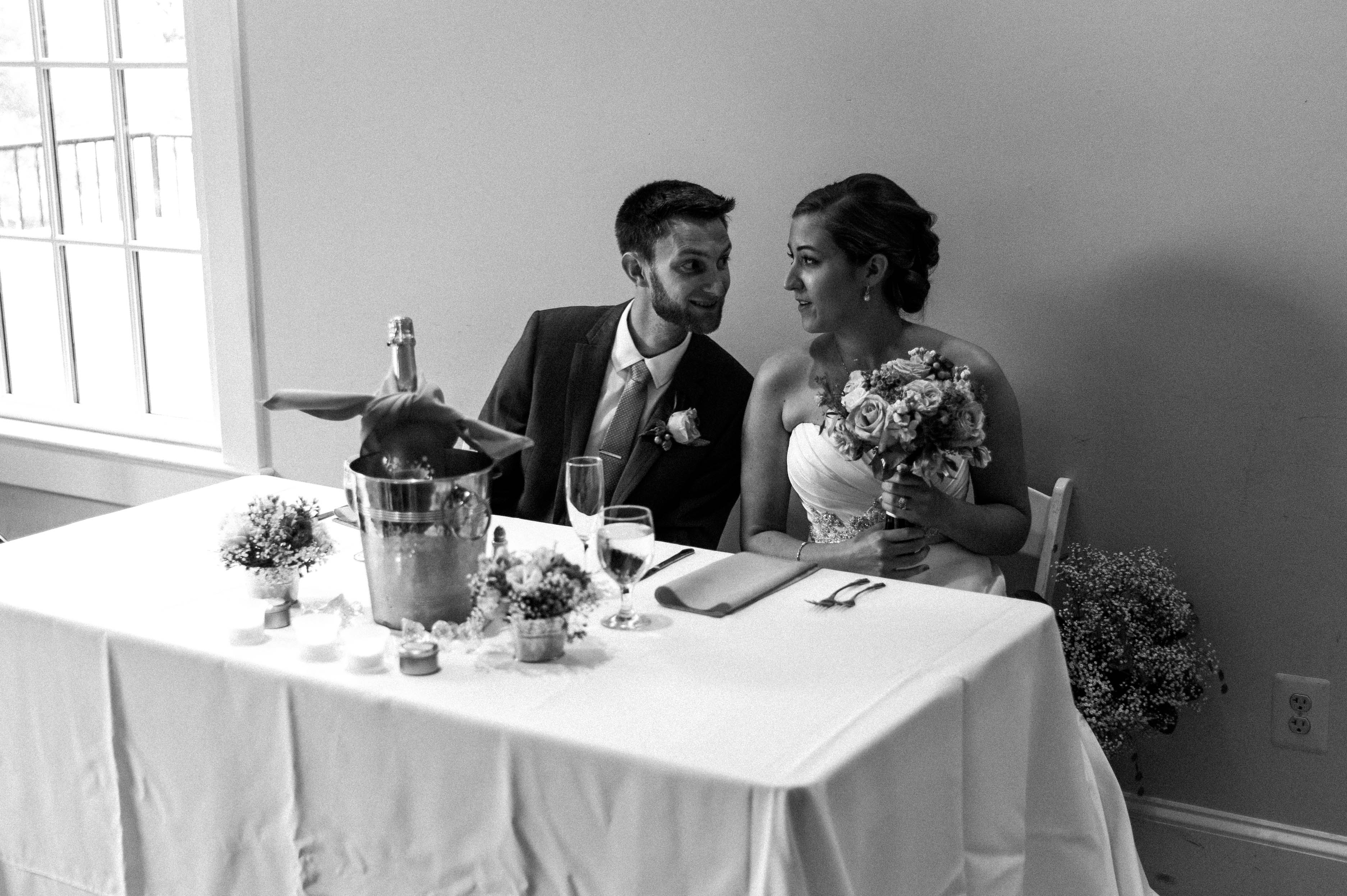 Captured in a soft black-and-white, this intimate photograph showcases a newlywed couple at their reception, sharing a playful glance. The composition highlights their closeness with a beautifully set table adorned with flowers and champagne, while natural light from the window creates a warm, romantic mood that enhances the scene's candid joy.