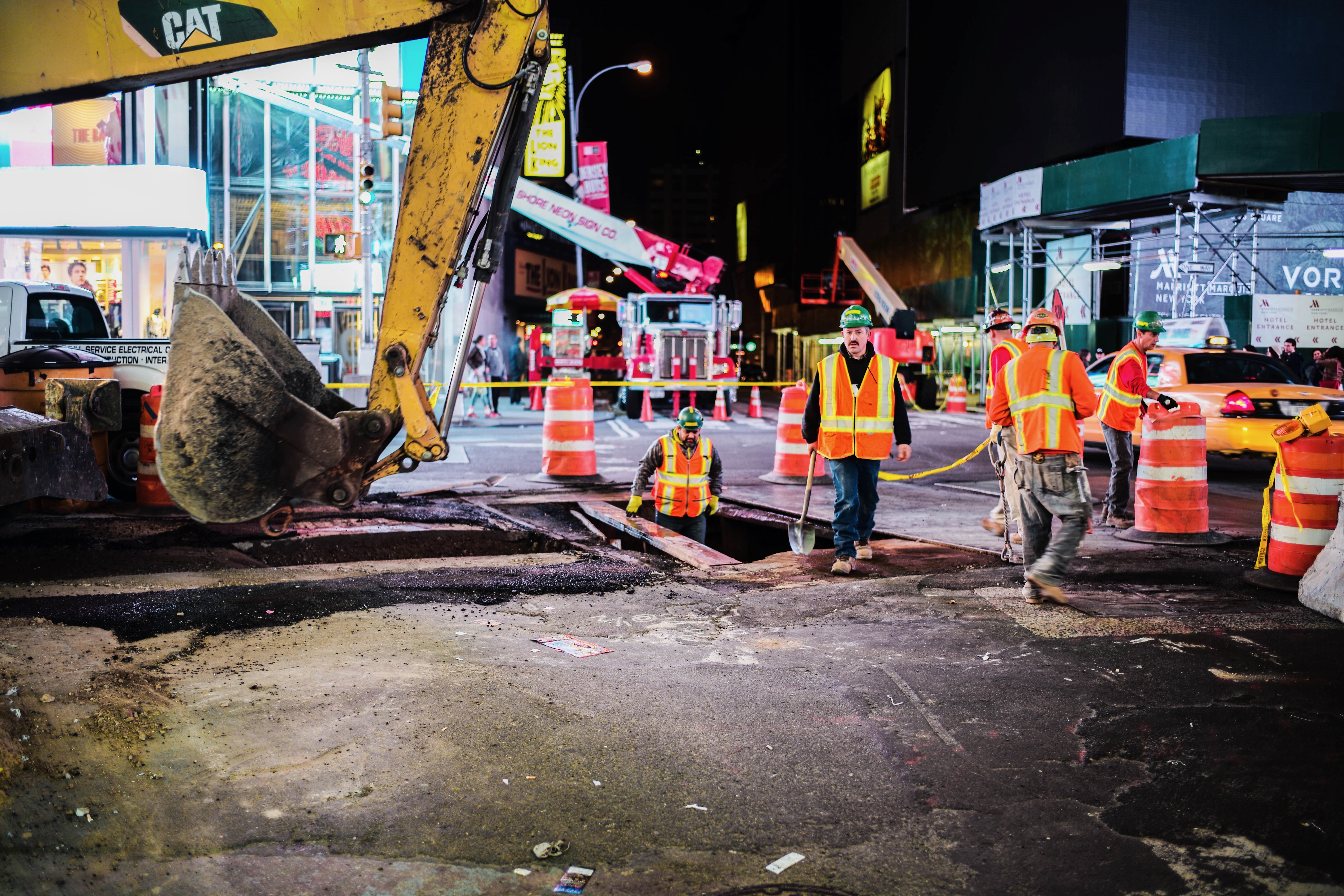In the heart of the city at night, a group of construction workers don vibrant orange vests as they labor around a large excavation site. The stark contrast of artificial lighting casts a surreal glow on the scene, highlighting the gritty determination of the crew amidst the bustling backdrop of urban life. Traffic cones and machinery frame the composition, encapsulating the chaos and order of nighttime construction work.