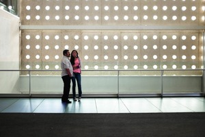 In this photograph, a couple stands closely together, framed against a backdrop of circular cutouts that allow soft light to filter through. The minimalist composition emphasizes their connection, while the muted colors and gentle lighting evoke a sense of intimacy and tranquility. The contrast between the structured environment and their casual postures adds to the overall mood of serene companionship.