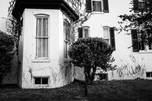 This photograph captures a weathered corner of a building enveloped in creeping vines, evoking a sense of nostalgia and decay. The black-and-white composition enhances the interplay of light and shadow, highlighting the textured surfaces and soft contours of the foliage. A quiet, contemplative mood permeates the scene, inviting viewers to reflect on the passage of time and the beauty in abandonment.
