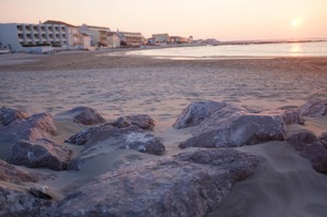 In this tranquil beach scene, smooth rocks punctuate the sandy shoreline, leading towards the soft glow of a sunset. The warm hues of orange and pink blend in the sky while the calm waters reflect the fading light, evoking a sense of peace and serenity. The composition captures both the natural elements and the charm of the coastal buildings, inviting a leisurely stroll along the shore.