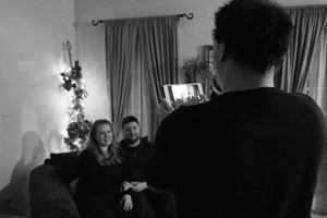 In a cozy, dimly lit room, a couple sits comfortably on a couch, radiating warmth and intimacy. The focus is on a figure holding a tablet, poised to capture a precious moment, while soft light filters in from the surrounding decor, enhancing the sense of nostalgia and connection.