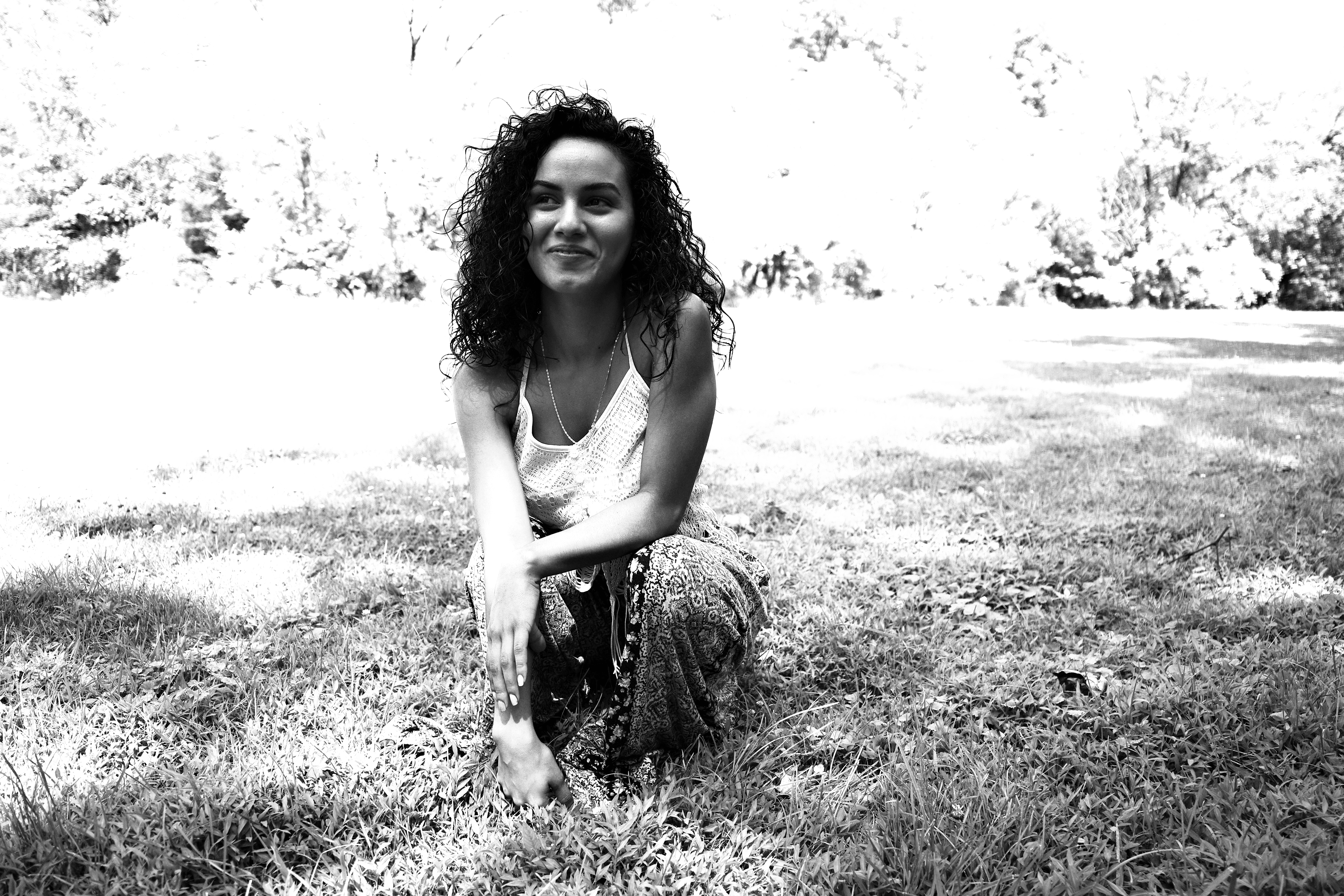 A young woman sits on lush grass, exuding a sense of calm and playfulness. The high-contrast black-and-white composition captures her relaxed posture and genuine smile, evoking a nostalgic mood. Sunlight filters through the surrounding trees, creating a dreamy backdrop that enhances the serene atmosphere of the moment.