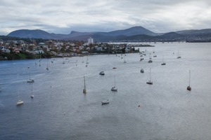 This photograph captures a serene harbor dotted with sailboats, reflecting the muted colors of an overcast sky. The composition draws the eye from the boats in the foreground to the rugged mountains in the background, evoking a sense of tranquility and solitude. Soft, diffused lighting enhances the peaceful mood, making this a perfect scene of coastal life amidst nature's grandeur.