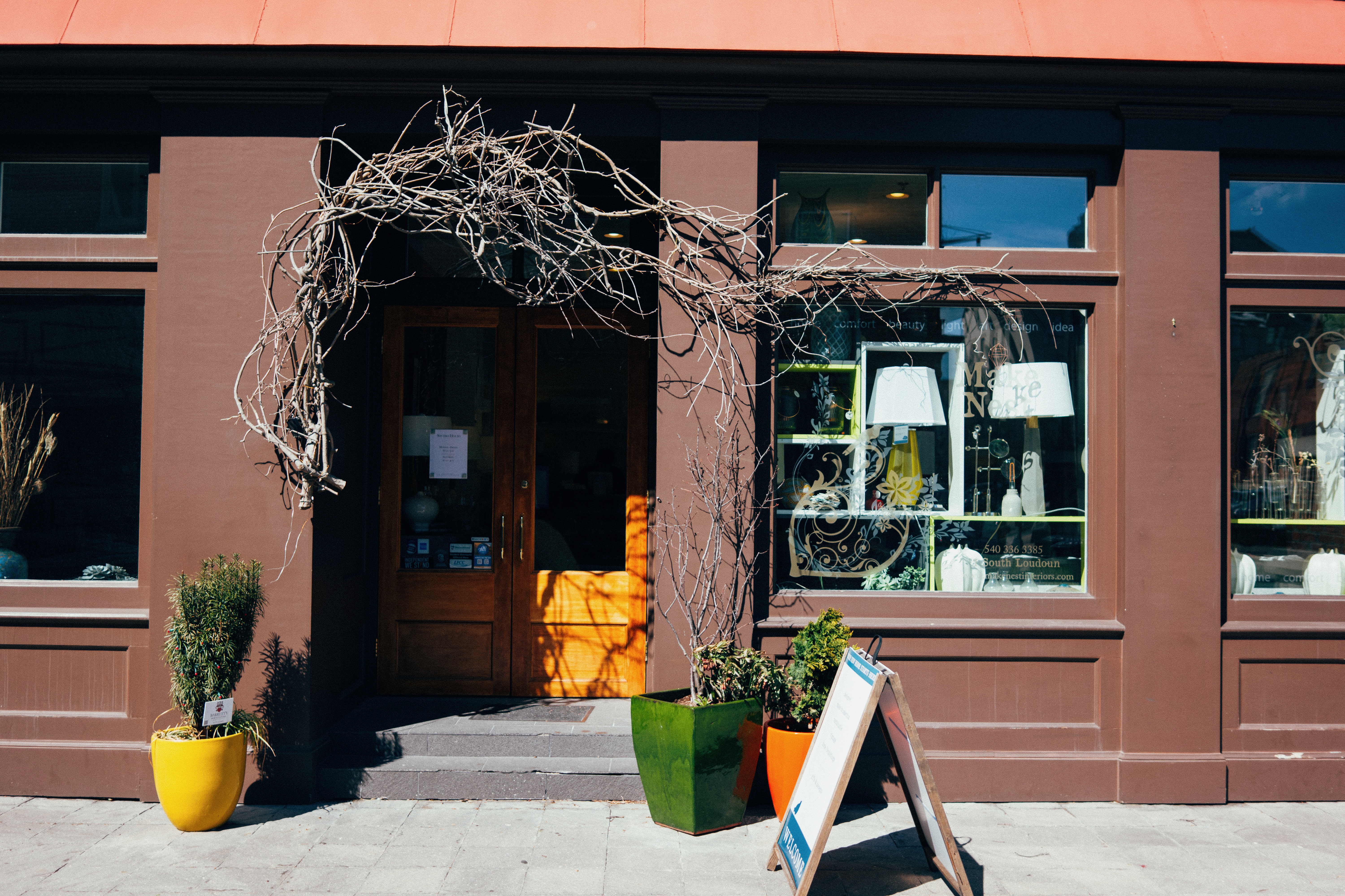 The photograph captures a welcoming storefront adorned with a natural vine arch, inviting onlookers inside. Brightly colored planters add a vibrant touch to the earthy tones of the building, while warm light spills through the large windows, enhancing the cozy atmosphere. The composition invites a sense of curiosity and charm, suggesting a treasure trove of unique finds within.