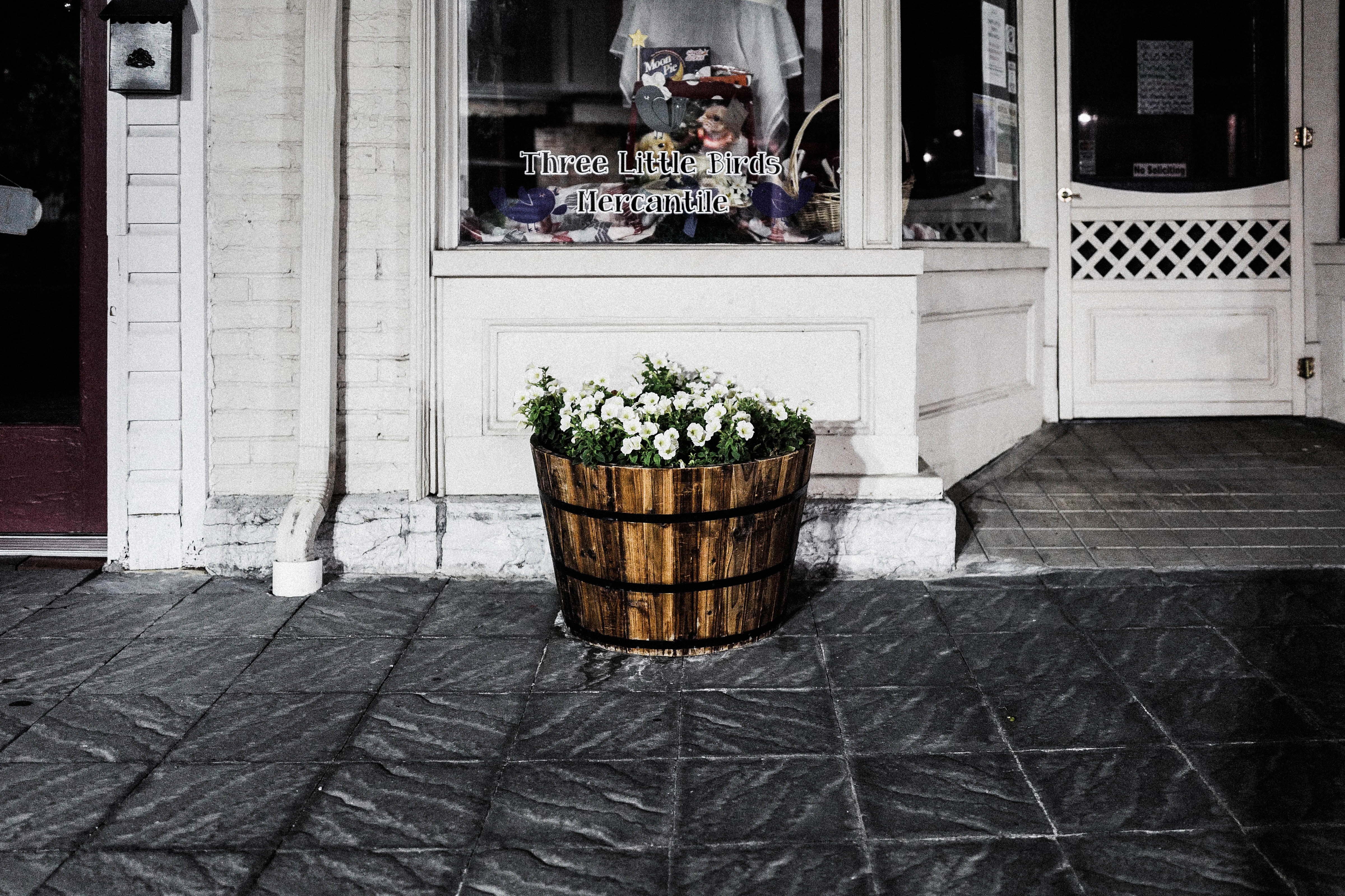 In the soft glow of night, a wooden planter brims with white flowers, creating a quaint focal point against the subdued backdrop of a mercantile storefront. The muted lights and shadows enhance the serene atmosphere, evoking a sense of stillness and charm. The composition draws the eye toward the window display, contrasting the vibrancy of nature with the calm of urban life.