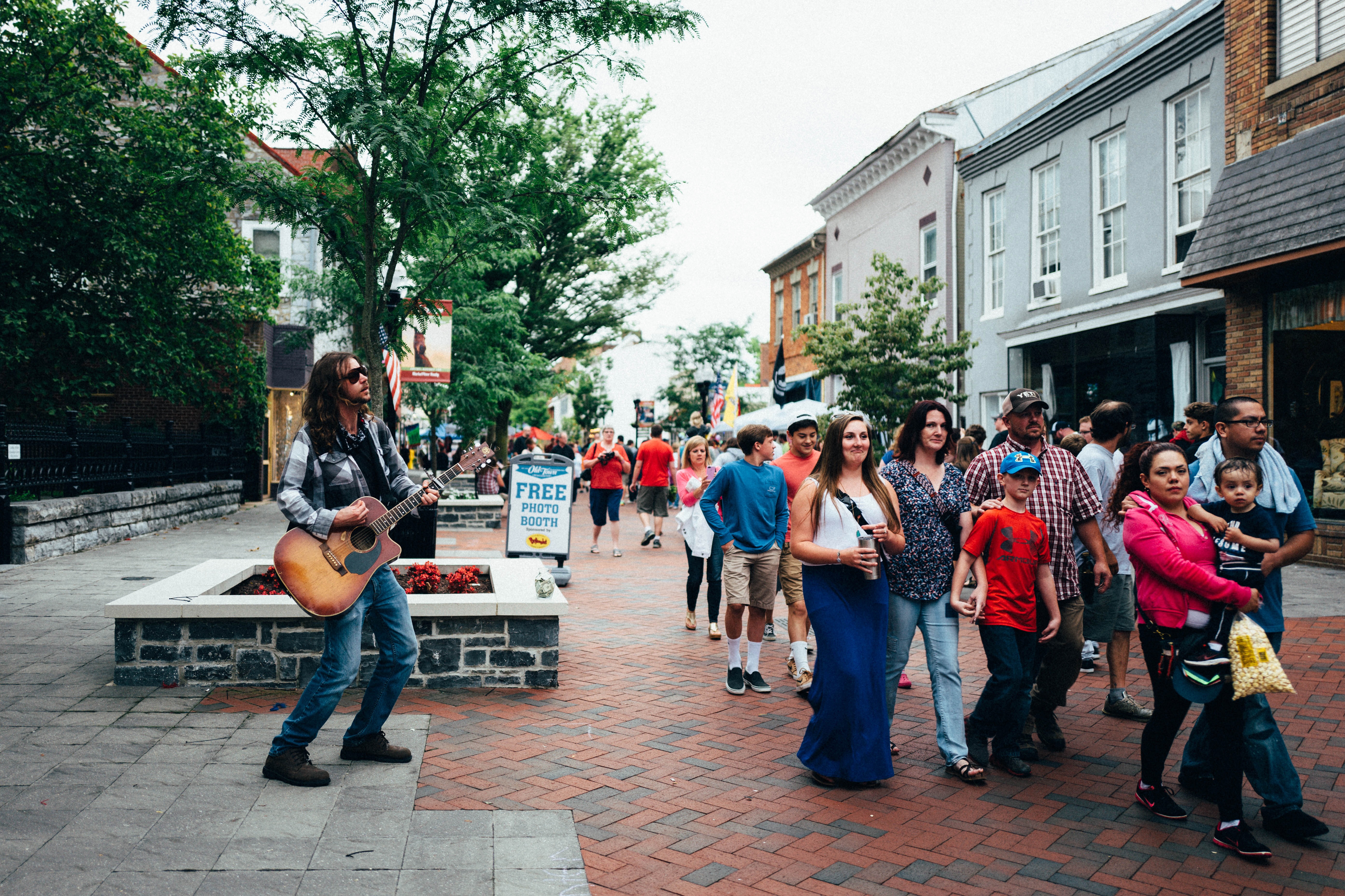 In a vibrant, bustling street, a guitarist captivates passersby with his soulful tunes, creating a lively atmosphere. The overcast sky adds a muted glow to the scene, enhancing the sense of camaraderie among the diverse crowd. As people stroll and engage with each other, a sense of community and joy permeates the air, inviting warmth even in the gray light.