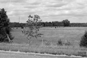 The photograph captures a serene, monochromatic landscape dominated by a gently sloping field dotted with the occasional tree and a solitary cow grazing in the distance. The soft, diffused light from an overcast sky envelops the scene, creating a tranquil and reflective mood. The composition draws the eye from the foreground's detailed foliage, across the open field, to the distant treeline, evoking a sense of quiet isolation and peacefulness.