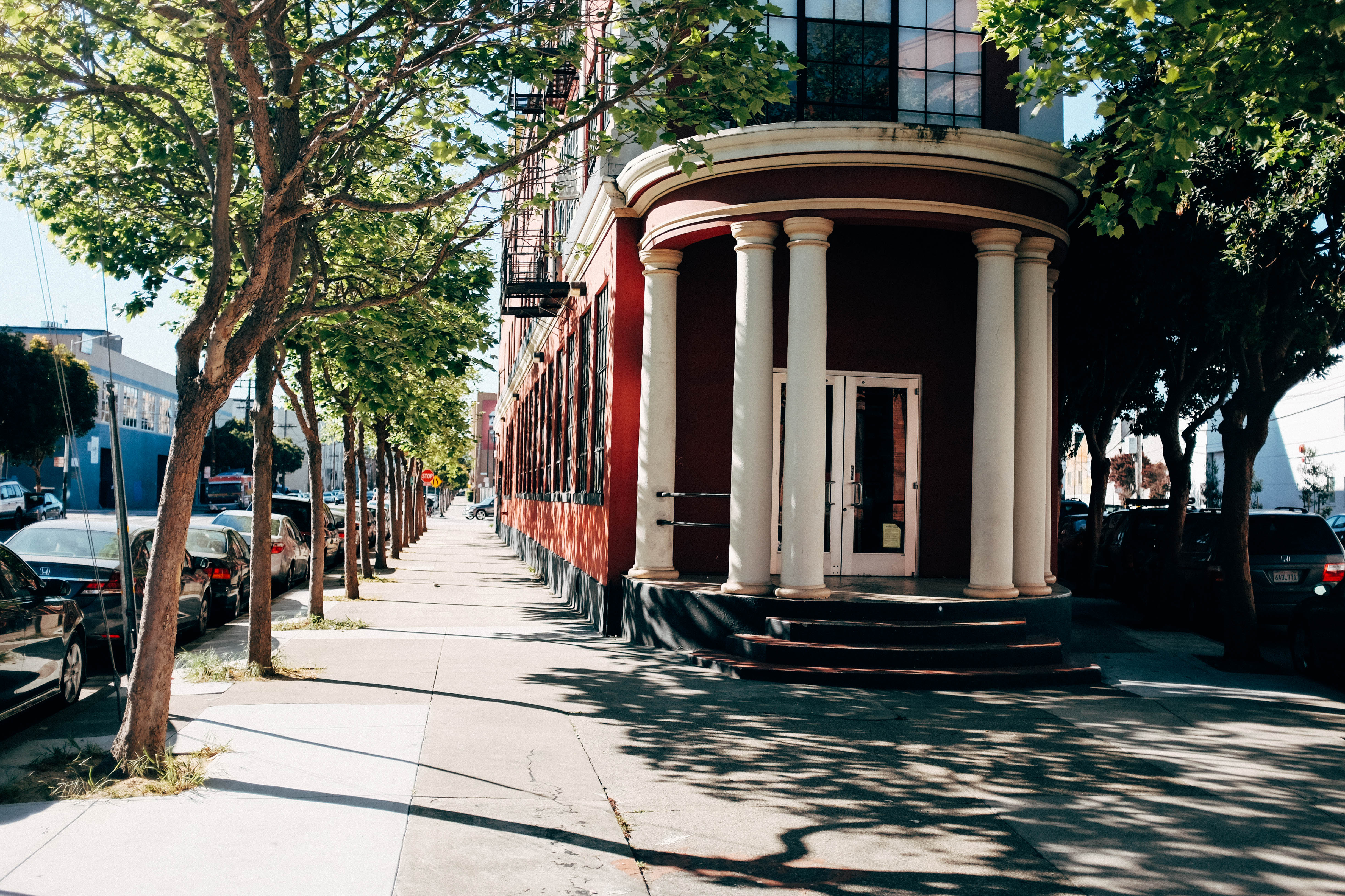 In this photograph, a striking red building with classical columns stands prominently amidst a tree-lined sidewalk. The soft sunlight filters through the branches, casting delicate shadows that dance along the pavement. The scene evokes a serene yet vibrant urban atmosphere, inviting the viewer to explore the quaint streets.