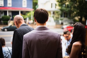 The photograph captures the back of a group of elegantly dressed individuals standing at a doorway, framed against a backdrop of softly blurred houses and foliage. The warm lighting creates an inviting mood, hinting at a moment of anticipation and camaraderie as they prepare to step outside. The juxtaposition of their formal attire against a vibrant street scene evokes a sense of occasion and connection.