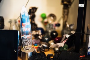 The photograph captures a glass trophy prominently displayed amidst a chaotic array of eclectic objects, reflecting both accomplishment and everyday life. Soft, diffused lighting enhances the trophy's clarity while casting gentle shadows on the cluttered background, creating a dynamic yet intimate atmosphere. The vibrant colors and textures contribute to a sense of nostalgia and personal history, inviting the viewer to explore the stories behind the items.