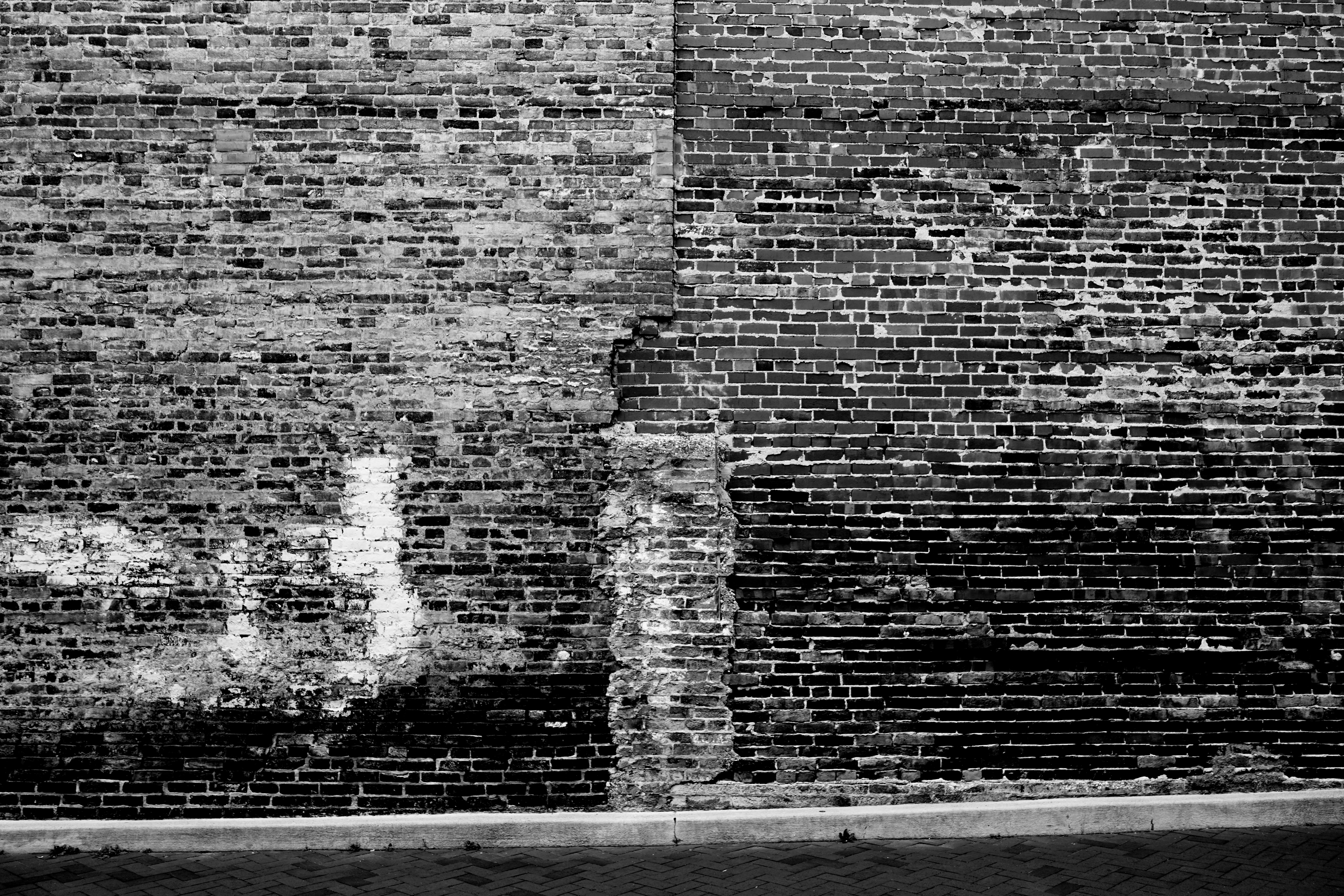 This black-and-white photograph showcases two contrasting textures of brick walls, evoking a sense of history and decay. The interplay of light and shadow accentuates the weathered surfaces, creating a somber and reflective mood. The composition draws the eye along the cracked and faded bricks, inviting contemplation of the passage of time.