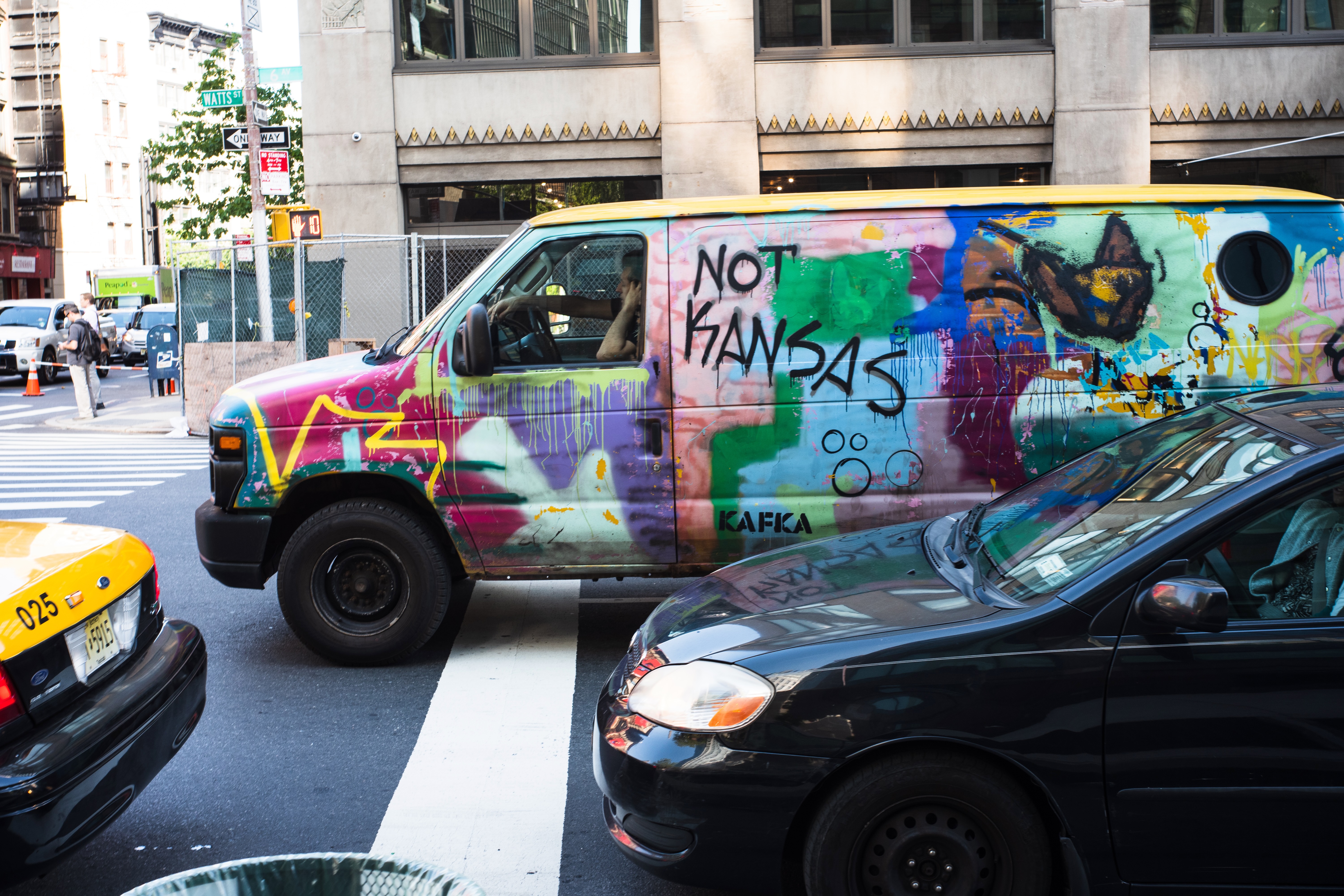 A vibrant graffiti-covered van stands caught in the urban rush, surrounded by traffic. Bold colors and playful text evoke an eclectic, rebellious spirit, contrasting with the more muted tones of nearby vehicles. The sunlight casts a warm glow, enhancing the lively atmosphere of the cityscape.